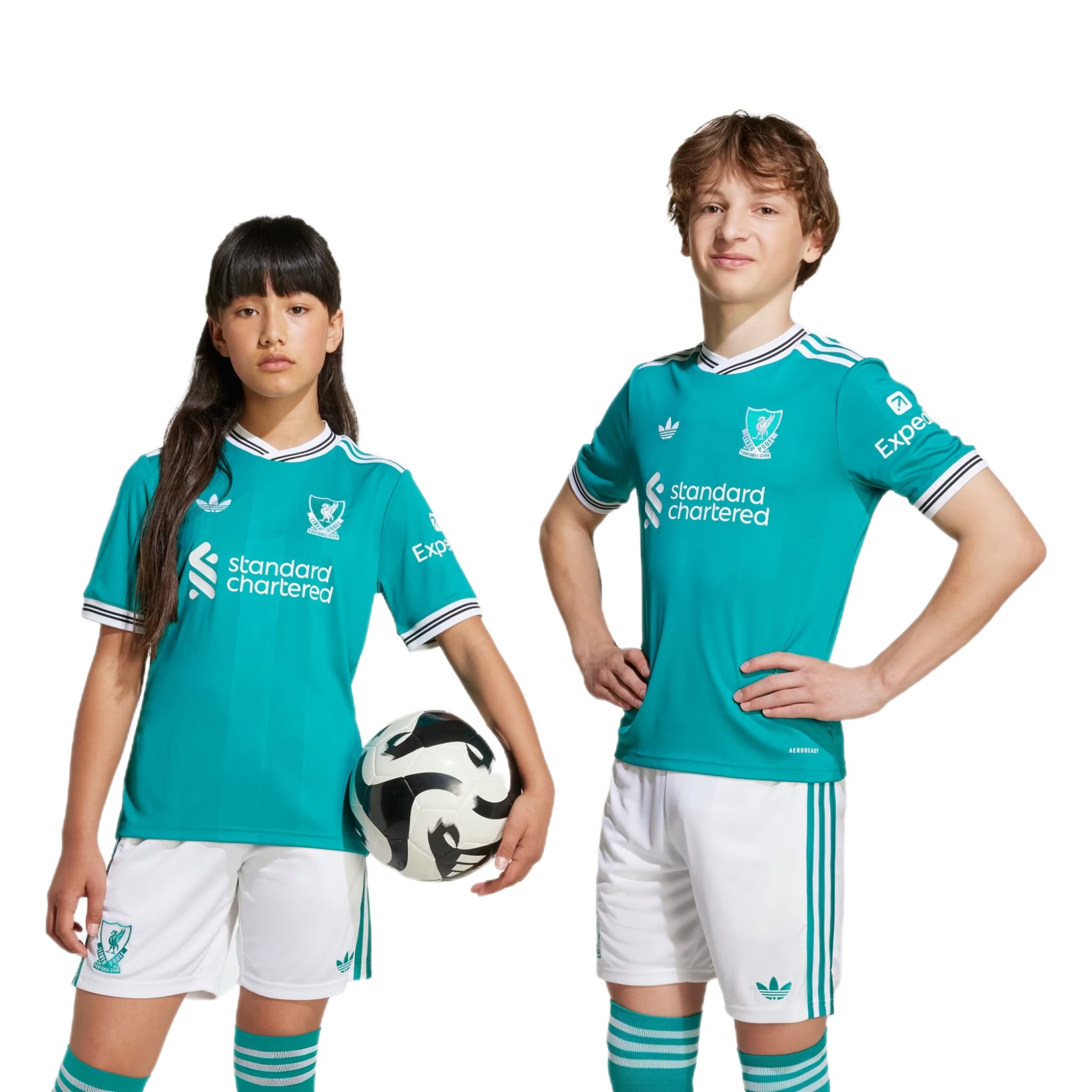 A modern football classic inspired by Liverpool FC’s storied 3-Stripes history. The tonal vertical stripes on this juniors’ third jersey come in unmistakable adidas Equipment green. On the chest, that vintage club badge shares the spotlight with a Trefoil for the first time since 1991. Created for travelling Reds, this shirt includes moisture-managing AEROREADY so it feels as good as it looks.