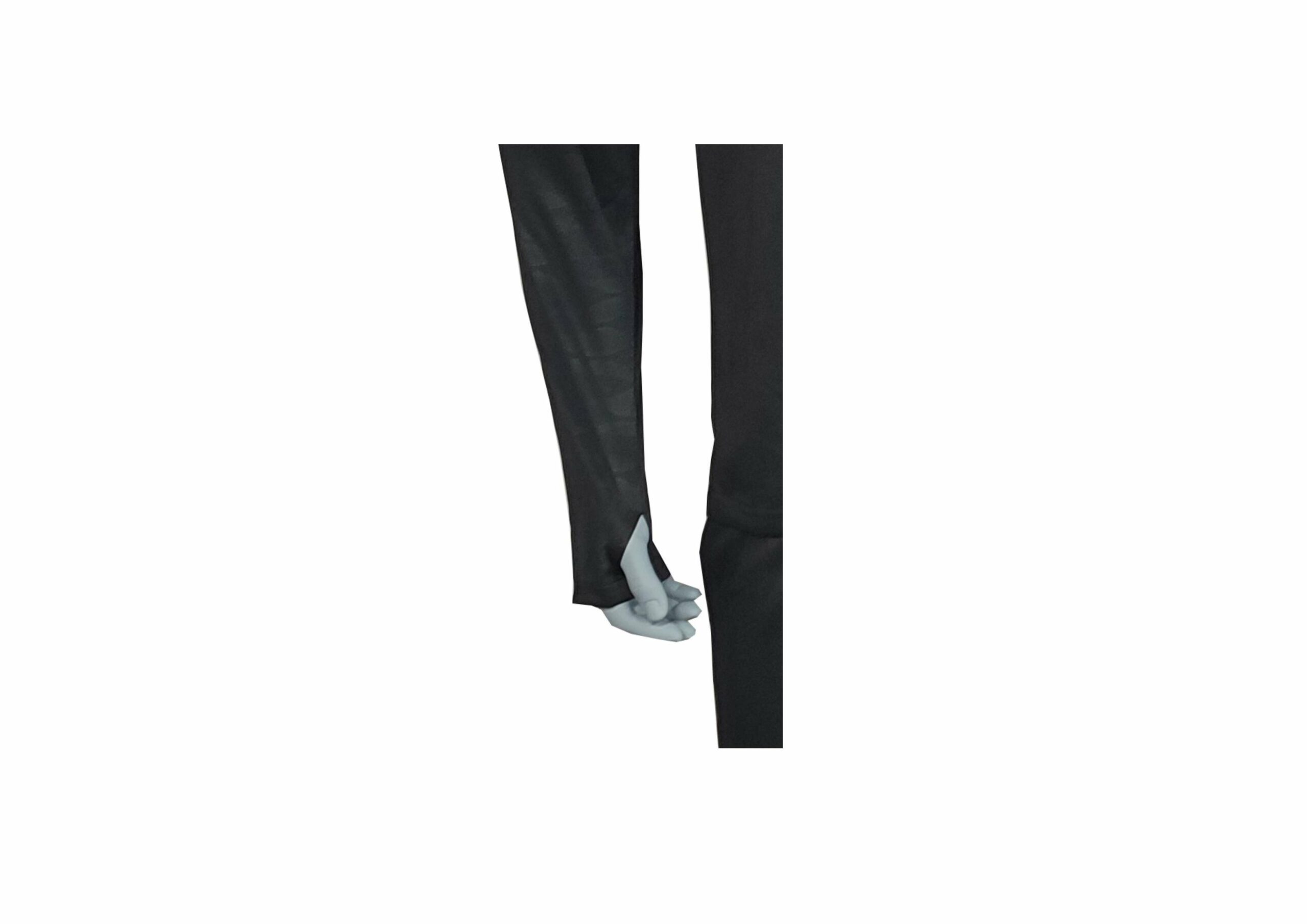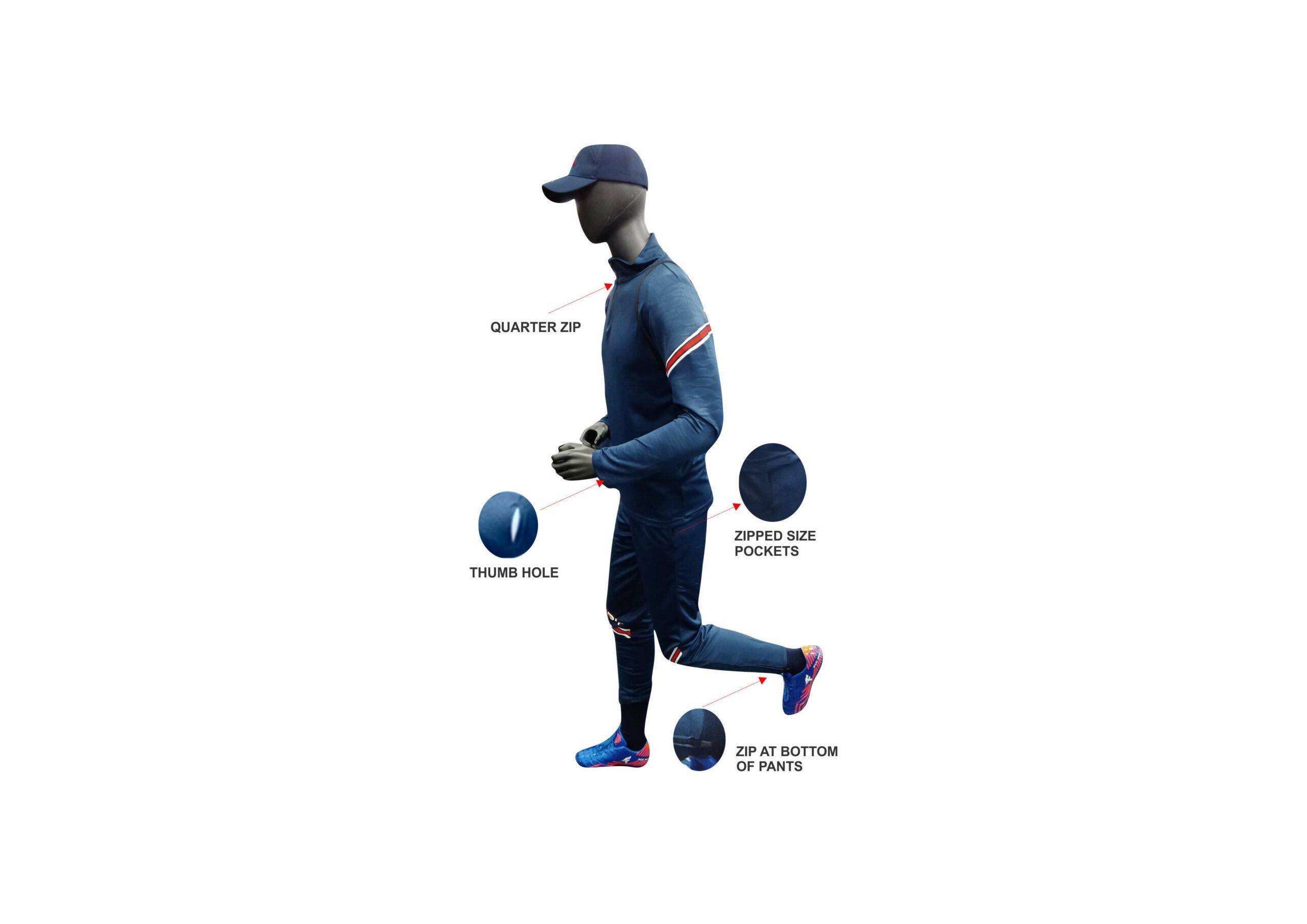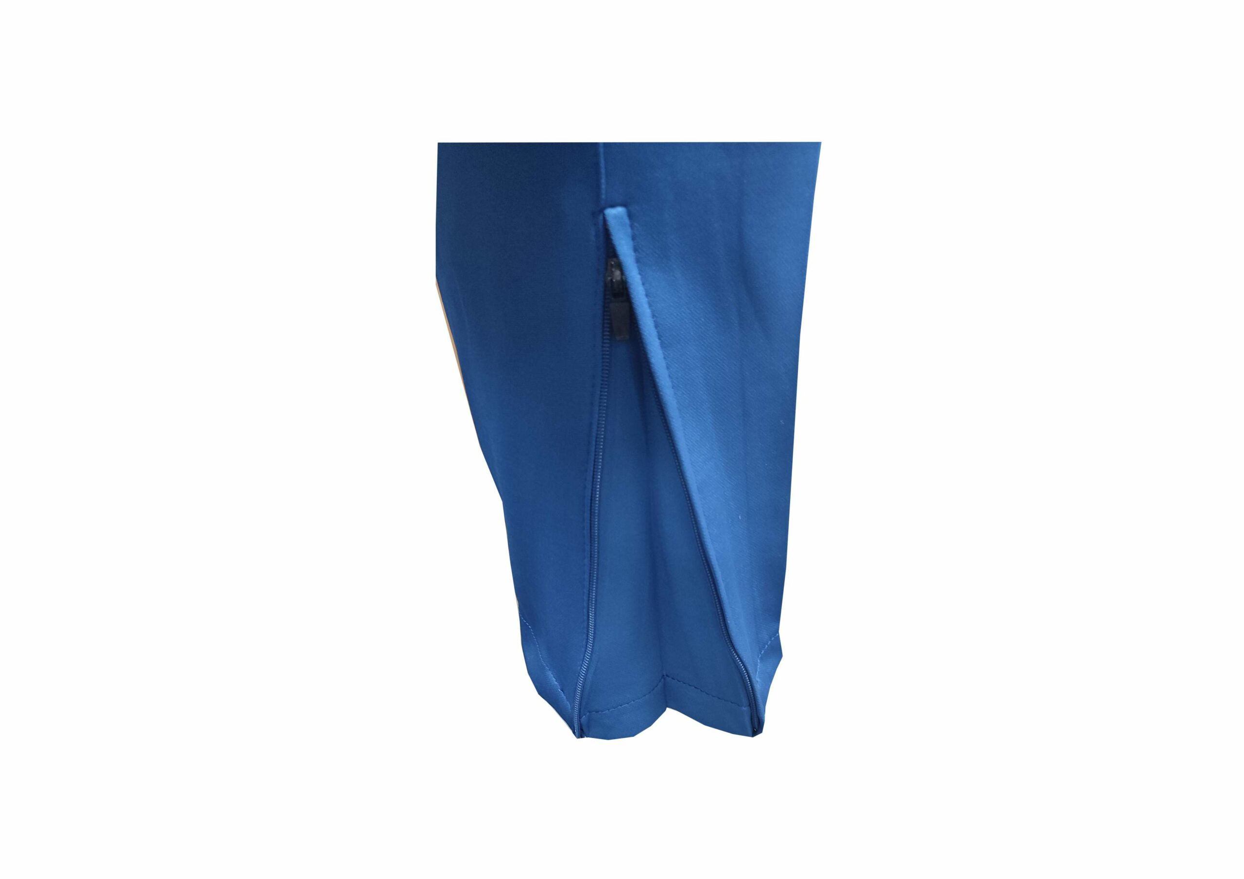 Pants: Side pockets with zip and zip at bottom of pants.